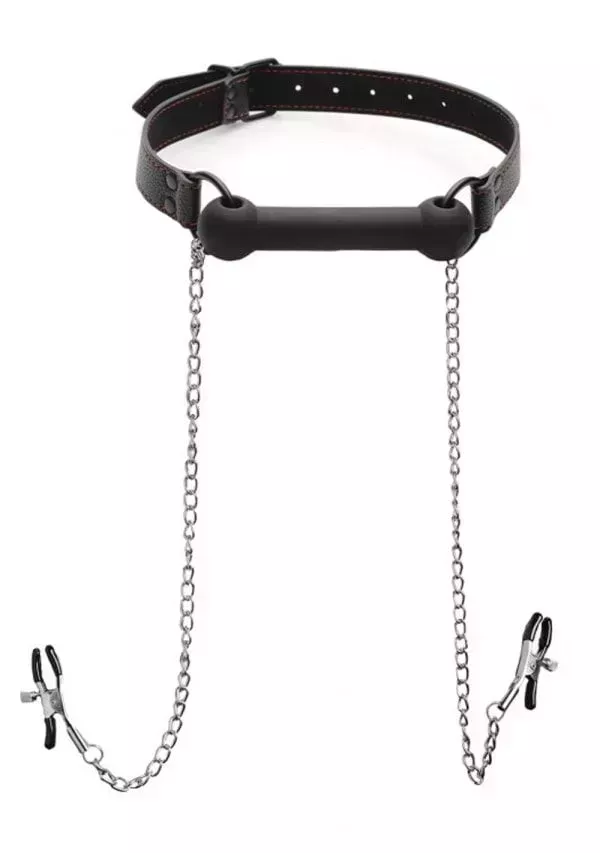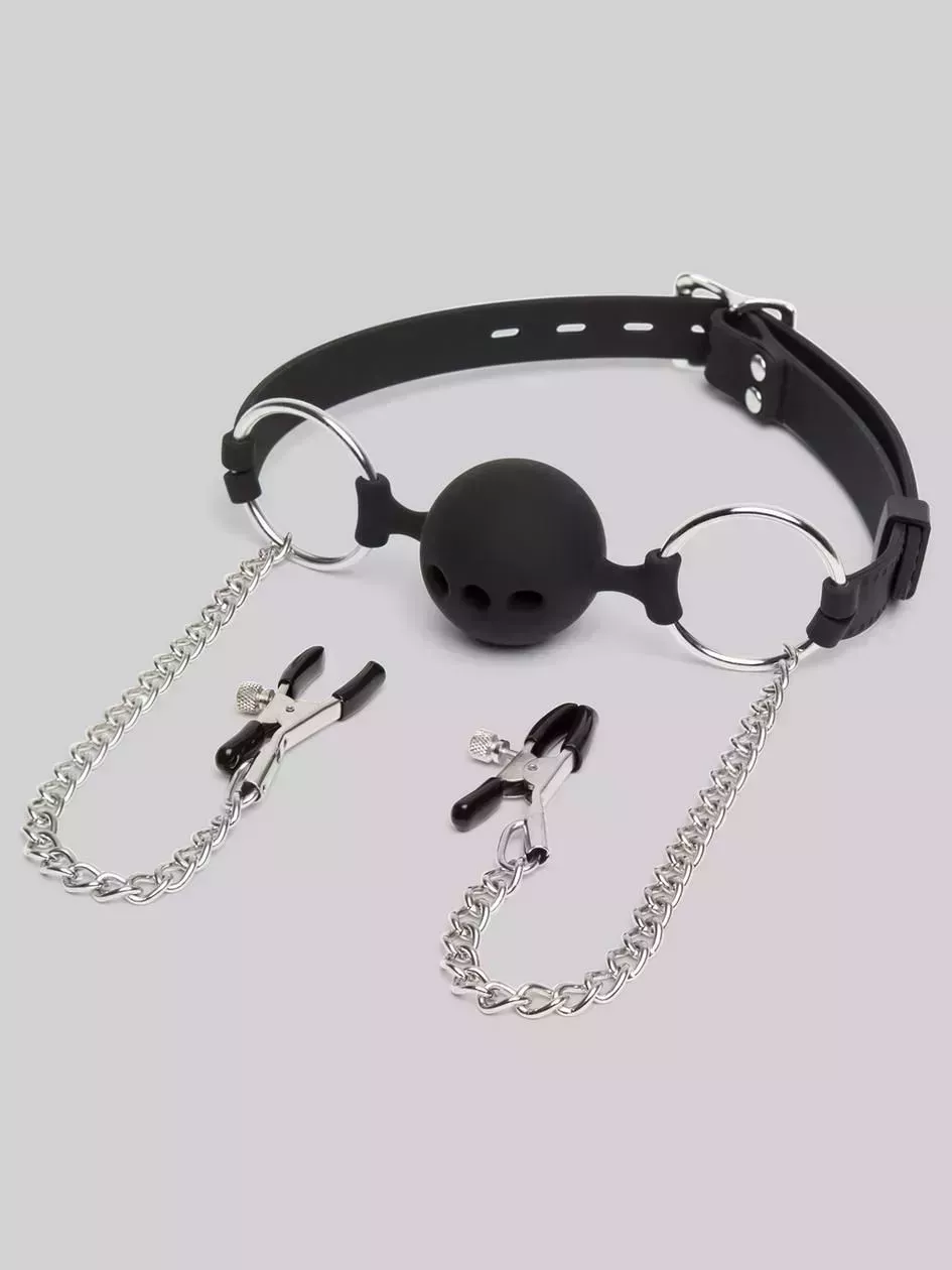 Otra gran opción para los más avanzados es esta mordaza de bola con pinzas para los pezones. Esto puede ser más difícil que una mordaza de barra, así que asegúrese de que está preparado para evitar el dolor potencial de la mandíbula. Los dos anillos en cada lado también se puede utilizar para enlazar otros accesorios también.