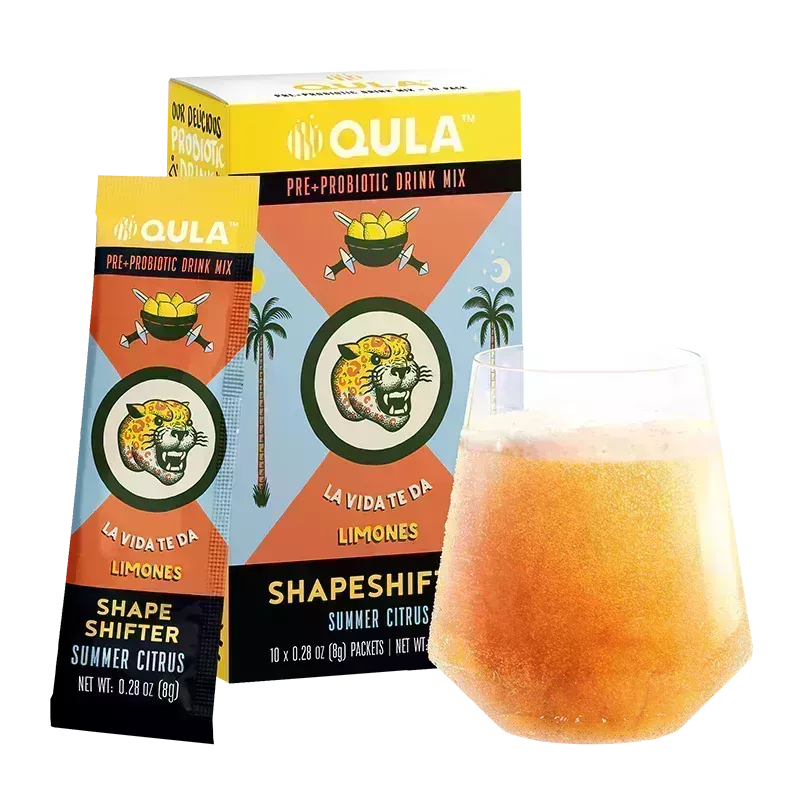 Para conseguir ese doble efecto, echa unos cuantos paquetes de la mezcla de kombucha Shapeshifter de Qula en tu bolso junto con el spray para la garganta. Solo tienes que añadir agua y tendrás una deliciosa bebida cítrica repleta de prebióticos, probióticos, fibra de frutas y mucho más. Bajarás del avión sintiéndote mejor que cuando embarcaste.