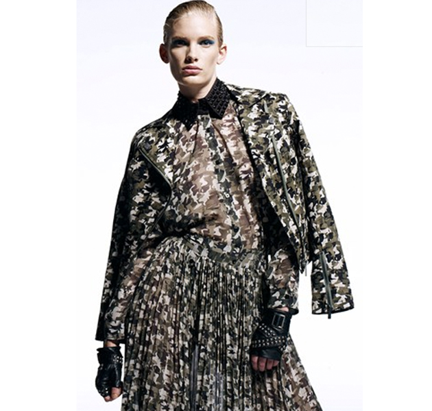 Ni las creaciones de Lagerfeld se libran del estampado militar, uno de los que más nos cansaremos antes de que comience el otoño. Y nos parece algo muy raro que el del pelo canoso haya optado por él, pues nos parece demasiado hype, para él, pero ya veis, sorpresas te da la vida…