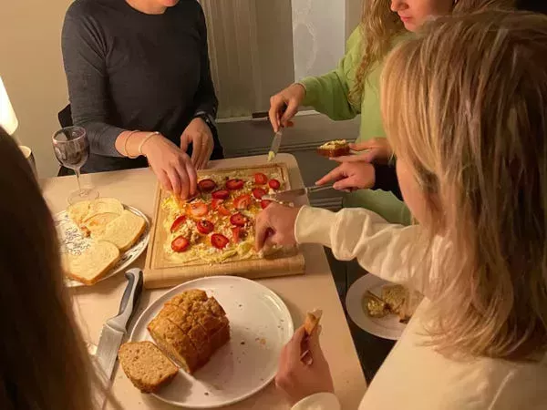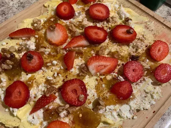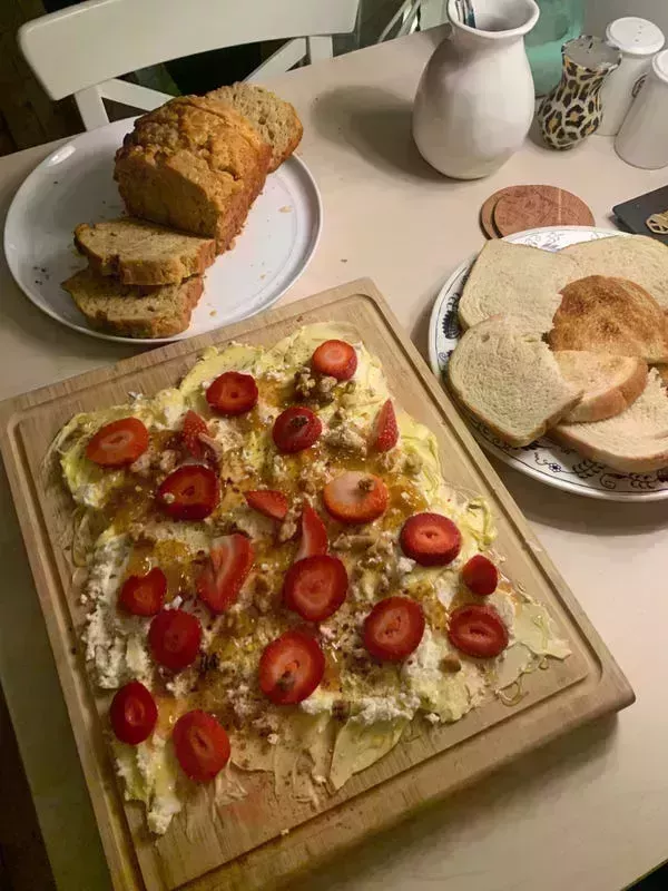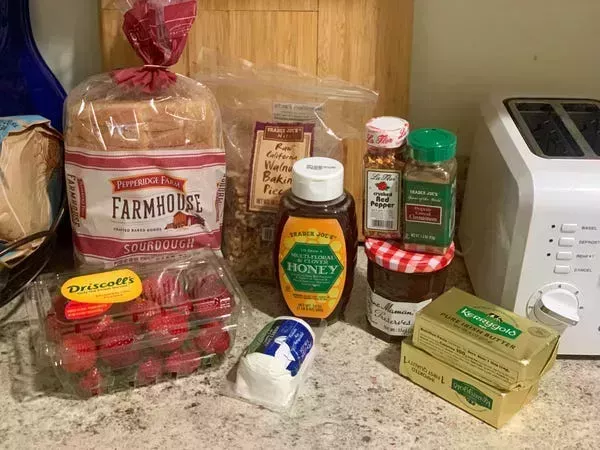 Decidí utilizar una receta presentada en este TikTok de @thesammyschnur que requería pan de masa madre, higos, mermelada de higo, miel, copos de pimienta roja, canela, queso de cabra, mantequilla y fresas. Fui a tres tiendas en busca de los higos, pero aún así me faltaron, así que los dejé fuera. Comprar todos los ingredientes desde cero me costó unos 50 dólares.