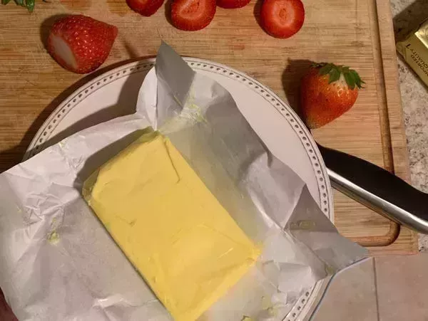 Si hubiera tenido más tiempo, habría dejado la mantequilla a temperatura ambiente para que se derritiera ligeramente y se pudiera untar. Pero no lo tuve, así que corté la barra en secciones iguales y las metí todas en el microondas durante intervalos de cinco segundos hasta que estuvo blanda y untable. Funcionó igual de bien. Mientras tanto, corté las fresas en rodajas finas.