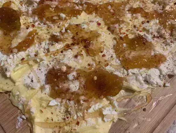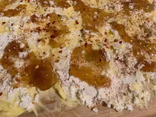 Ah, queso de cabra: Este es otro elemento que desearía haber dejado calentar a temperatura ambiente durante más tiempo para que fuera más fácil de untar. Sin embargo, incluso si no lo haces, está bien.