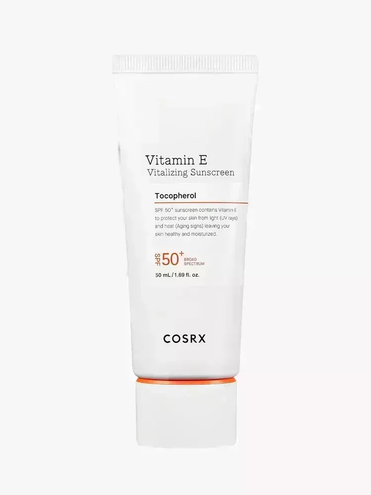 Cosrx's Vitamin E Vitalizing Sunscreen te cubre con SPF 50+ y una fórmula rica en antioxidantes con cacao calmante, algodón y mezcla de vitamina E. Y "sin mancha blanca" básicamente no hace falta decirlo a estas alturas.