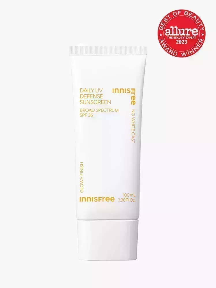 El protector solar Daily UV Defense de Innisfree ganó un premio Best of Beauty 2023 porque, además de ser asequible, se absorbe de maravilla y deja un acabado de rocío, con la ayuda del té verde y el aceite de semillas de girasol.
