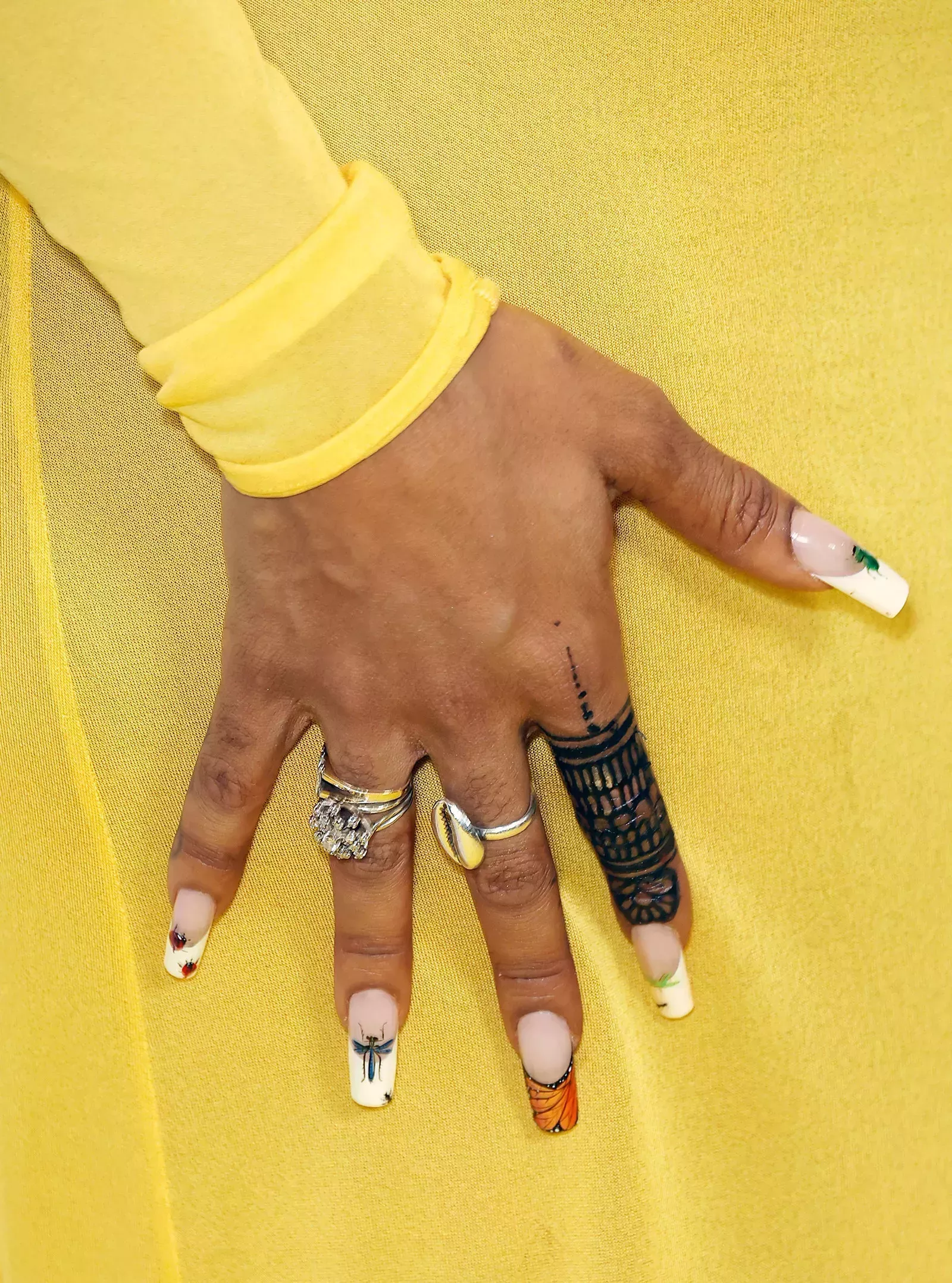Para los premios iHeart Radio, la músico dio un toque atrevido (¿o deberíamos decir zumbón?) a la clásica manicura francesa con las criaturitas más bonitas y detalladas pintadas en cada punta. Sus uñas tenían forma de cuadrados suaves y estaban pintadas al típico estilo francés, pero en lugar de simples puntas blancas brillantes, diminutos bichitos revoloteaban y saltaban en cada dedo. ¡Tenemos mariquitas! Tenemos saltamontes. Tenemos alas de mariposa monarca que cubren toda la punta. Básicamente, SZA tiene todo un ecosistema de insectos en sus uñas, e incluso si te dan miedo los bichos, no se puede negar que se trata de una verdadera obra de arte en las uñas.