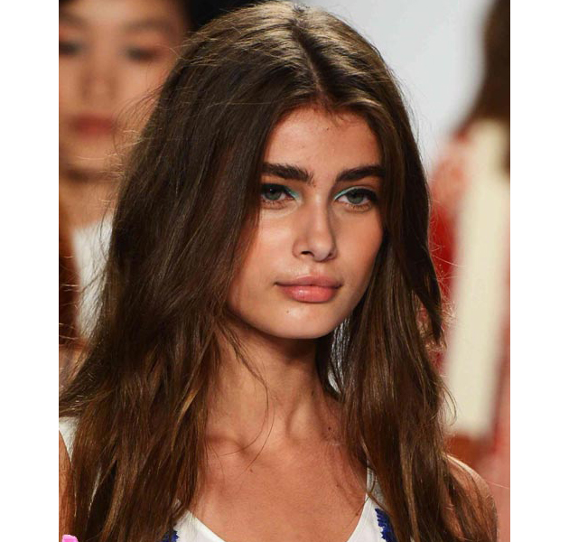 El rostro se lleva glossy, muy jugoso y lleno de brillos; se deja para otra temporada los looks mate y empolvados. El maquillaje trabaja los ojos, en sombras azul celeste y el resto del rostro permanece moreno y natural. Las cejas se despeinan y se llevan hacia arriba, revueltas y descuidadas.