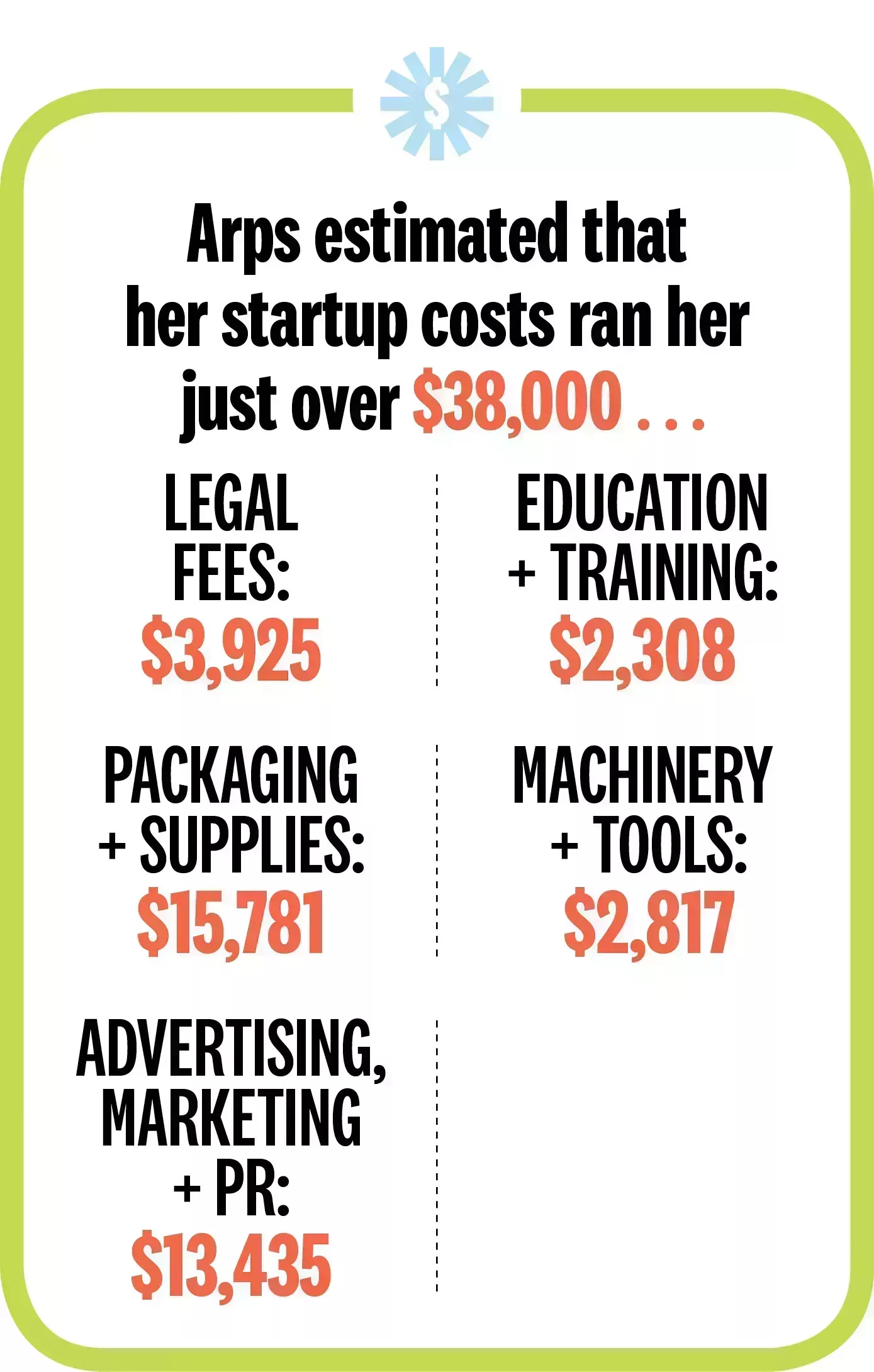 Gastó 150 dólares en ingredientes para hacer sus bases y envases. También utilizó el sitio web Sticker Mule para crear las etiquetas de sus productos, que pueden costar entre 50 y 130 dólares, dependiendo de la cantidad de etiquetas que se pidan. Creó su propio sitio web con Squarespace por 25 dólares al mes y encontró un creador con sede en Los Ángeles que sólo le cobró 100 dólares por el diseño del envase, ya que sólo estaba tratando de ampliar su cartera.