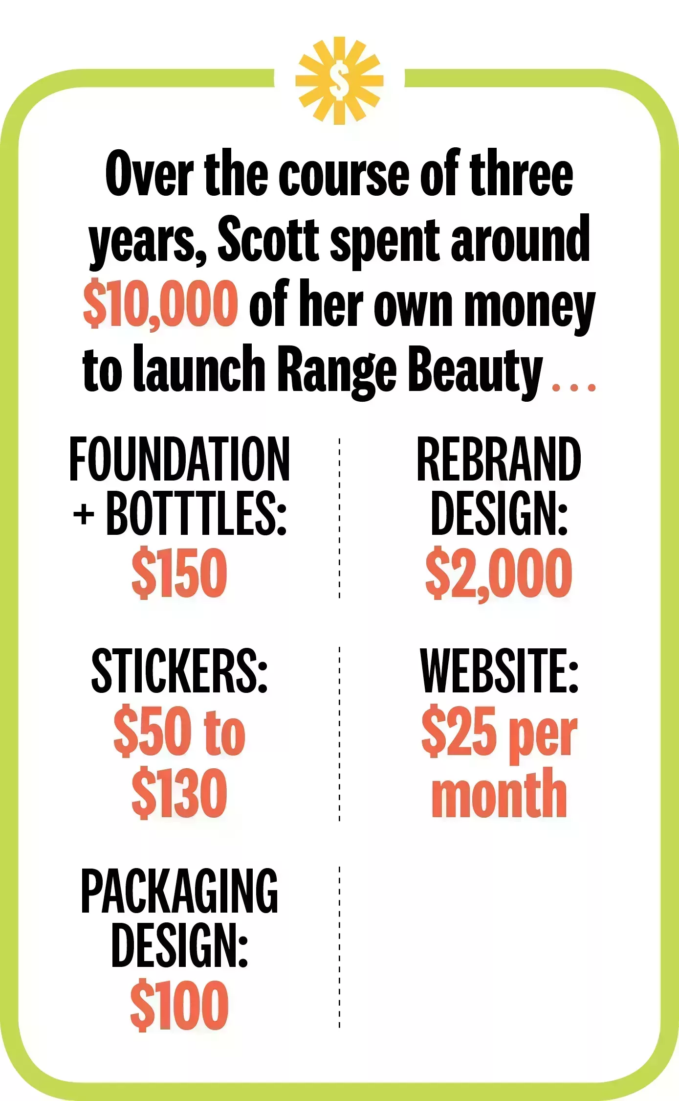 La empresa se lanzó en mayo de 2017 y cuatro meses después cambió de marca con el nombre de Range Beauty. Rápidamente añadió cuatro nuevos productos y amplió su gama de tonos de bases de maquillaje de 14 a 21. Al final, el cambio de marca le costó 2.000 dólares. Como todavía trabajaba como analista de recursos humanos, Scott financió su proyecto con su sueldo.