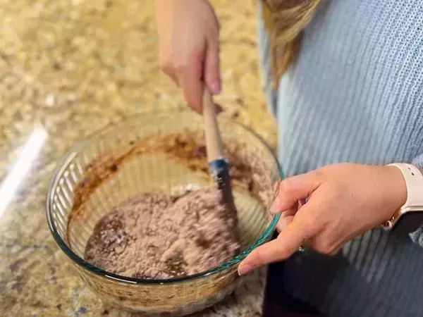A continuación, añada los ingredientes secos e incorpórelos. Pero tenga cuidado de no mezclar demasiado la masa, un error común que da lugar a postres densos y sin vida.