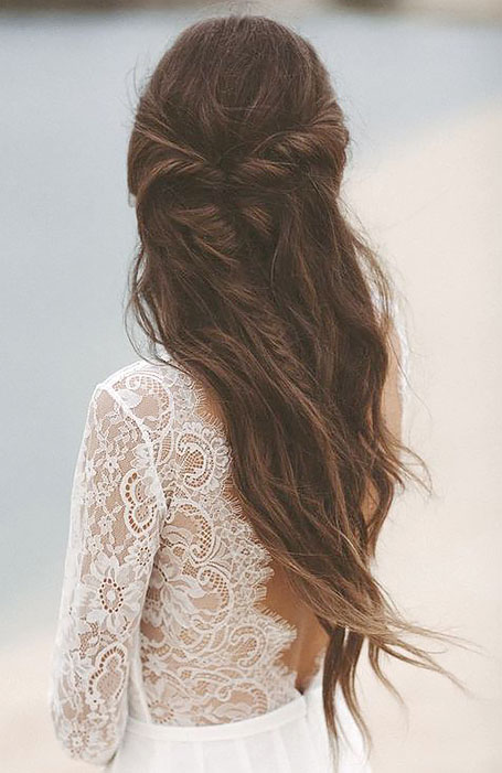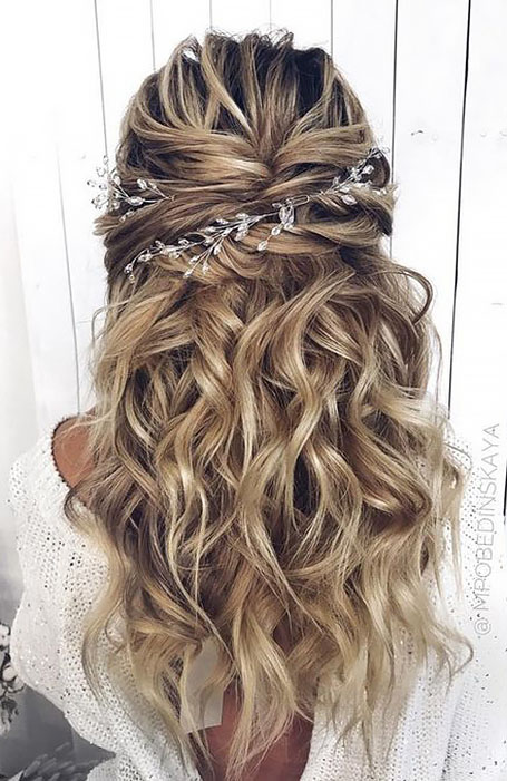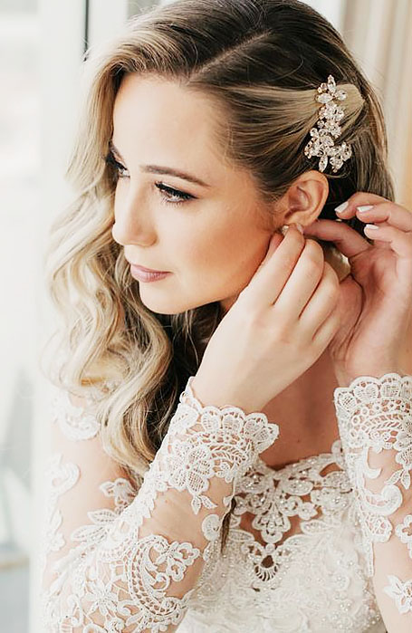 El peinado Half Up, Half Down te da lo mejor de ambos mundos. En primer lugar, podrás lucir la longitud y el volumen natural de tu cabello con ondas suaves y bonitas, dándote un acabado romántico y femenino. En segundo lugar, la parte superior del cabello que se tira hacia atrás significa que puedes mostrar más de tu rostro. Además, puedes agregar hermosos detalles como trenzas y giros, y accesorios para el cabello para hacer que tu estilo de novia sea aún mejor.