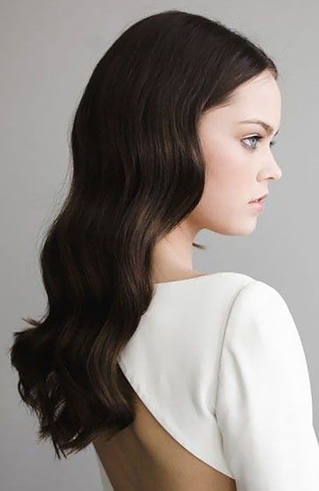 El estilo glamuroso de Hollywood nunca pasa de moda, y un precioso peinado vintage Hair Down es también muy halagador en todas las formas de la cara. También conocido como Golden Age waves, el look es pulido, chic y sexy sin ser abiertamente retro. Los elementos clave son la separación lateral y las ondas suaves y estructuradas. Añade un clásico labio rojo de los años 50, y voilà, eres una novia explosiva.
