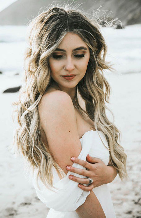 El ondulado es el peinado ideal para las novias que planean una boda en la playa. También se adaptan a los que tienen el pelo largo y grueso por naturaleza con una textura ondulada. Para aprovechar al máximo el estilo, espolvorea tus raíces con polvo voluminizador y usa un spray de acabado para evitar que tus olas se esponjen. Las ondas sueltas también se ven hermosas cuando se combinan con accesorios para el cabello como clips, flores y diademas. Otra opción popular es un estilo medio-arriba con olas sueltas debajo.