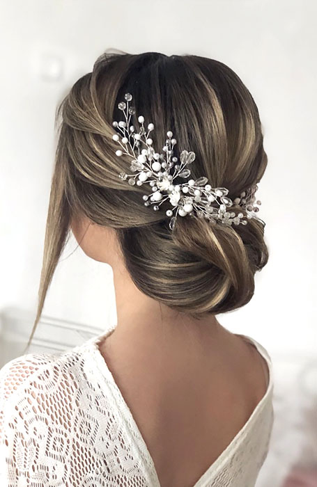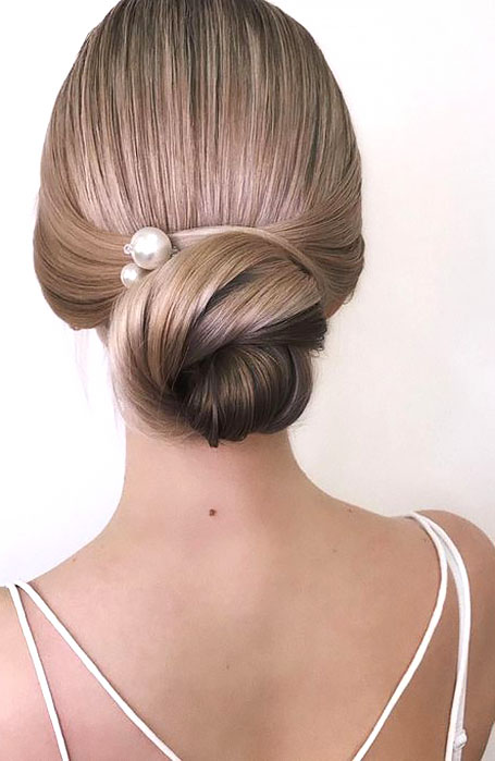 El moño bajo es elegante y chic. Eso lo hace ideal para las novias que quieren un peinado moderno y de moda que vaya con su vestido igualmente discreto. Las perlas son una de las tendencias más importantes en accesorios para el cabello esta temporada y son una gran adición a un peinado con bajo moño. Debido a que todo tu cabello está tirado hacia atrás, también es importante recordar que todos los ojos estarán en tu cara. Como resultado, una piel brillante y un maquillaje perfecto son esenciales cuando se usa un bollo bajo.