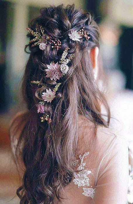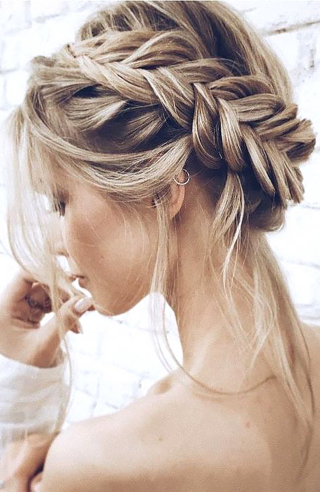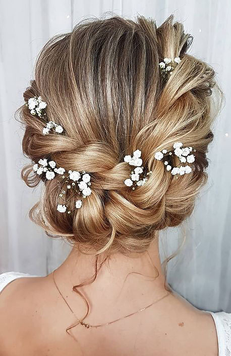Si siempre has querido el pelo de una princesa de cuento de hadas, el updo romántico es para ti. Estos peinados tienen que ver con los detalles femeninos, como las trenzas y las flores. Sin embargo, no son demasiado lisos o pulidos. Recuerde que no debe trenzar su cabello demasiado apretado y que debe dejar algunas piezas para suavizar la apariencia y lisonjear su cara. Las flores diminutas como el aliento del bebé se adaptan al traje romántico porque son lo suficientemente pequeñas como para no distraer de los detalles trenzados. Acompaña el estilo con un vestido de novia igualmente romántico.