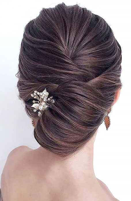Similar al moño, el giro francés es un precioso peinado nupcial que tiene clase y es sofisticado. Inicialmente, fue popular en los años 50, 60 y 70, y ahora está volviendo a ponerse de moda. El giro francés es un peinado más formal, por lo que se adapta a las novias que quieren un look de boda pulido y tradicional. Lo mejor de todo es que se trata de un estilo relajado para crear, ya que simplemente implica recoger y retorcer el cabello hasta que se pliegue sobre sí mismo, y luego asegurarlo con alfileres, portaobjetos o un peine.