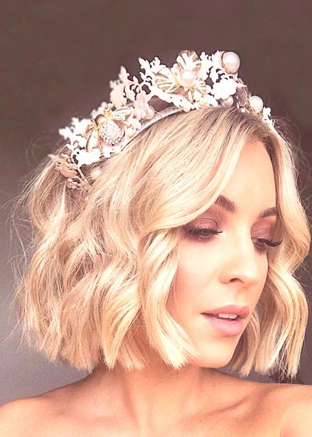 Con el lobulillo recortado, las opciones para las novias de pelo corto nunca han sido mejores. Cuando no tiene mucho largo con el que trabajar, es importante añadir volumen, rebote y dimensión a su corte. Comienza por peinar tu cabello con calor para crear ondas y rizos, luego agrega mucho spray de textura para lograr un acabado moderno pero pulido. Para el toque final de 'novia guay', agregue una diadema de declaración, como una cinta para el cabello o un fascinador.
