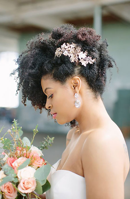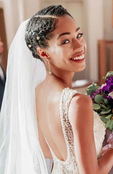 Las novias que desean lucir su cabello natural tienen muchas opciones de peinado. Para los más atrevidos, las trenzas de limonada o un falso halcón pueden ser la elección perfecta. De lo contrario, un updo afro o natural podría ser ideal. Muchas novias con cabello natural eligen no tener velo, por lo que sus rizos y dobleces pueden ser el centro de atención. En ese caso, usted podría mantener la sensación nupcial usando un encaje o una pinza de pelo floral en su lugar.
