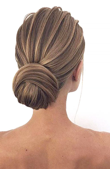 Estilo nupcial popular a principios de los años 2000, el bollo de bailarina está volviendo. Esto se debe a que este peinado chic es clásicamente elegante y pone tu maquillaje en el centro de atención. Se adapta a los que tienen la cara ovalada y los pómulos altos. Atrae la atención, por lo que es el compañero perfecto para un look de maquillaje atrevido. Es también una gran opción nupcial si quieres lucir tus joyas, como un par de aretes o una gargantilla de diamantes, ya que tu cabello no las esconderá. Muchas novias optan por combinar este peinado con un vestido inspirado en el ballet, pero asegúrate de que no te pongas demasiado pesado en el tul, ya que no quieres que parezca que llevas un disfraz.