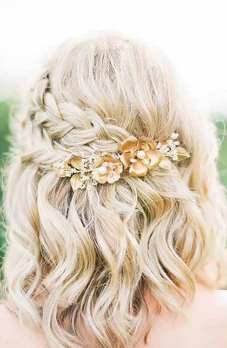 Puedes lucir una preciosa trenza de novia si no tienes el pelo muy largo. Utilizando sólo piezas de la parte superior del cabello, crea dos trenzas simples de tres vueltas a partir de las sienes. Trenzarla hacia la parte posterior de la cabeza y luego asegurarla con un bonito clip floral. Deja el resto de tu cabello suelto en ondas suaves; esto hará que se vea más grueso. El peinado medio trenzado es también una gran opción si eres dama de honor o invitada a la boda.