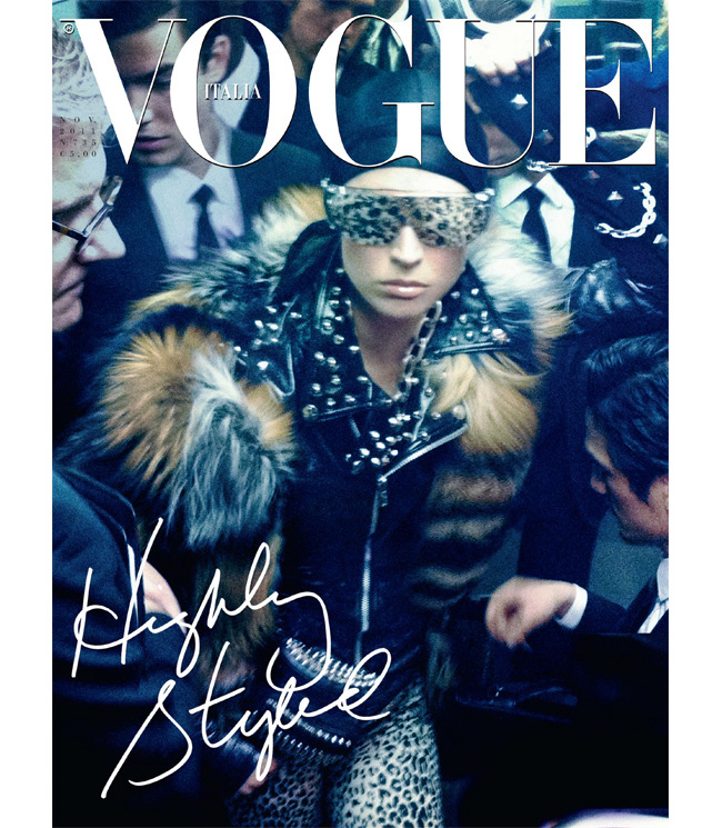 La otra está fotografiada por Steven Meisel y a Raquel Zimmermann como centro. La portada italiana es recargada y abigarrada, muy del estilo de esta revista. Hay una ausencia total de letras que sumarizan los contenidos del interior de la revista y sólo aparece una firma.