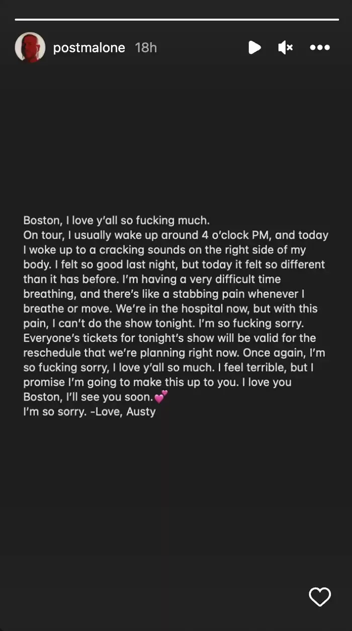 Post Malone pospuso una actuación en Boston el sábado tras anunciar en las redes sociales que ha sido hospitalizado con un "dolor punzante"