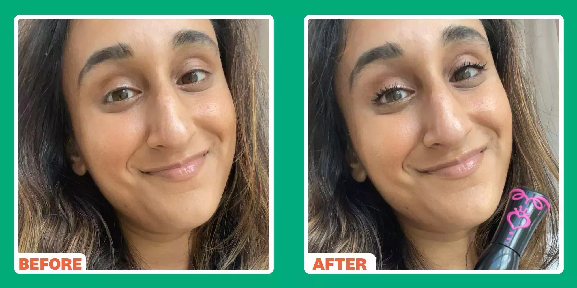 La única contra que diría es que no riza mis pestañas rectas tanto como me gustaría. Si eres como yo, definitivamente prueba la versión Curl de la máscara ($5, Amazon). No ofrece las mismas cualidades de alargamiento, pero ofrece un aspecto más rizado y natural. (Abajo puedes ver el antes y el después de mi uso en solitario).