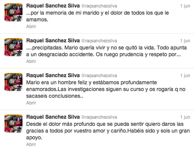 Han sido numerosos medios los que han dejado caer que Mario Biondo se suicidó, y eso ha sido lo que más le ha dolido a la presentadora, que ha tenido que dar explicaciones no sólo a través de Twitter en donde hemos podido leer el siguiente mensaje: "Mario quería vivir y no se quitó la vida. Todo apunta a un desgraciado accidente. Os ruego prudencia y respeto", sino que también ha elaborado una carta en la que vuelve a pedir que se deje de especular con la muerte de su marido.