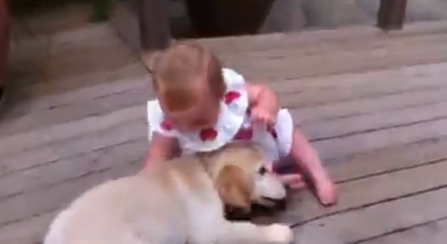 No os perdáis en el vídeo cómo reacciona el cachorro cuando ve al bebé, una niña de muy pocos meses, a quien parece confundir con otro cachorrito de su manada y con quien juega, abraza, mordisquea y trepa. Mientras el perrito mueve la cola entusiasmado con la visión de ese pequeño ser, la niña ríe y no teme jugar con ese compañero canino que acaba de conocer.