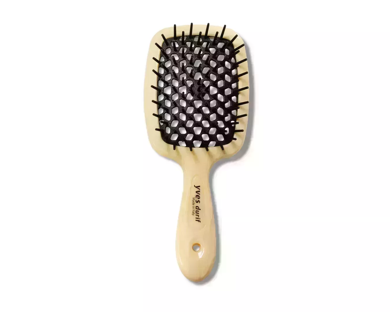 "Lo que hace especial al cepillo ventilado Yves Durif -aparte de lo bonito que queda en el tocador- es que es un cepillo extremadamente ligero, excelente para desenredar y alisar el cabello sin dolor. Y puede usarse con el pelo húmedo o seco".