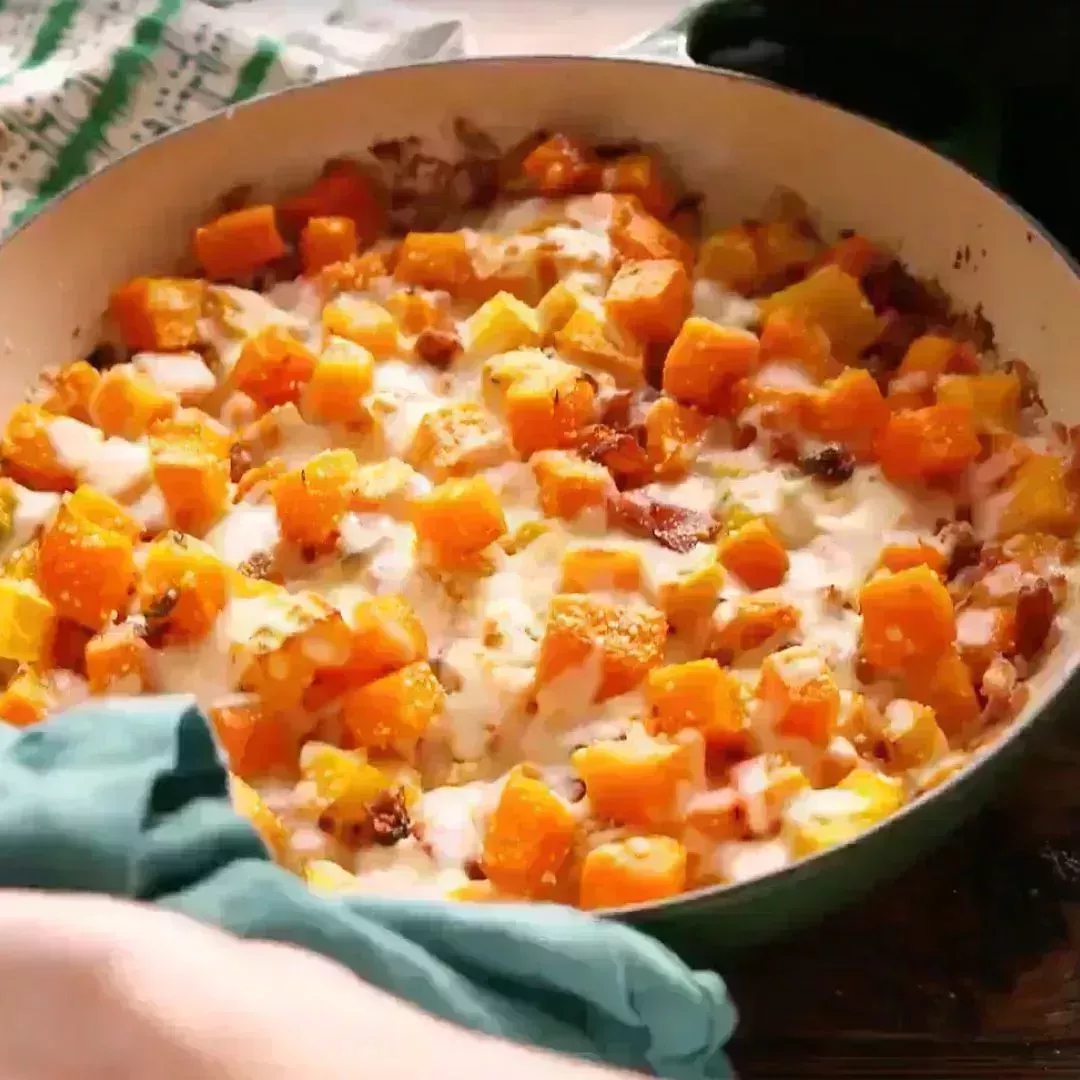 Esto es una gran pila de queso, tocino y bondad de calabaza.