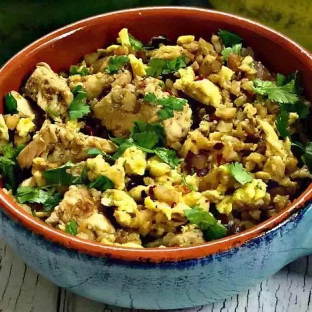 16 Arroz frito de coliflor con pollo bajo en carbohidratos y ceto.