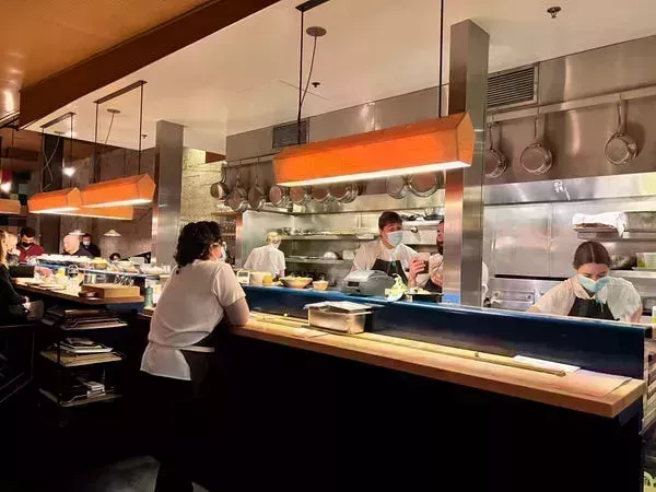 De camino a nuestra mesa, pasamos por el mostrador del chef y una cocina abierta