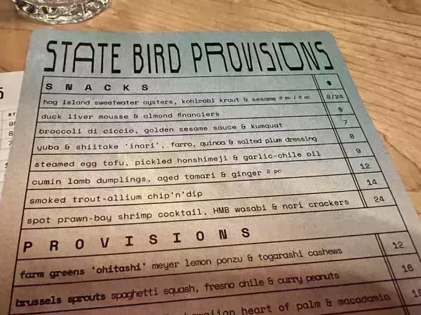 State Bird Provisions es un restaurante ruidoso y animado con un menú creativo y único a juego. Creo que es genial para una noche especial que no incluya gastar cientos en una comida.