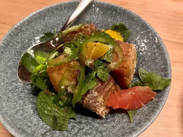 Para empezar, pedí la "ensalada" de vientre de cerdo con cítricos de invierno y vinagreta de salsa de pescado (18 $), que estaba en la sección de provisiones del menú.