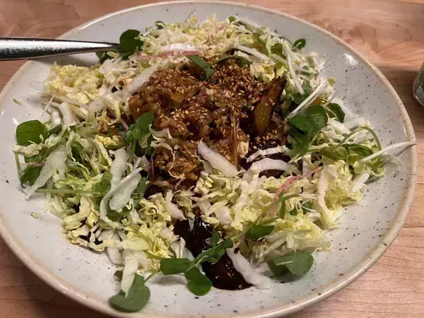 El arroz en sí era muy complejo y delicioso, y estaba ligeramente tostado en la parte inferior. El plato también estaba cubierto con semillas de sésamo y un lecho de verduras crujientes.