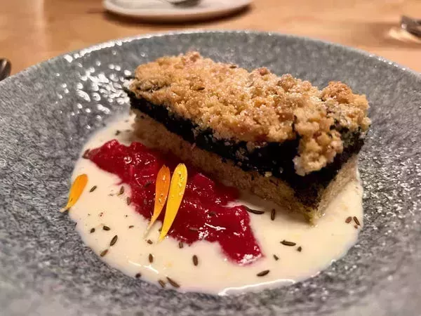 Era como una combinación de pastel de café y tarta rellena de una pasta dulce de sésamo. Junto con la crema aromática y la mermelada de ruibarbo dulce y ácida, cada bocado era una delicia única.