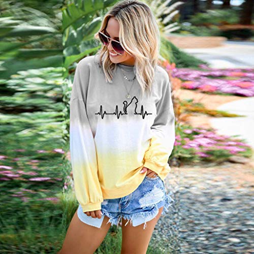 VEMOW Sudaderas Blusa Camisa De Las Mujeres Gradiente Contraste Gato De Color Impreso Manga Larga Parte Superior Pull-Over Camisa De Entrenamiento Camiseta Tops(Gris,M)