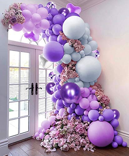 - Decoraciones para fiestas temáticas moradas: globos morados pastel, globos morados macaron, globos grises macaron, globos metálicos morados, globos de confeti morados y globos de corazón, una combinación perfecta para decoraciones de fiestas temáticas moradas.