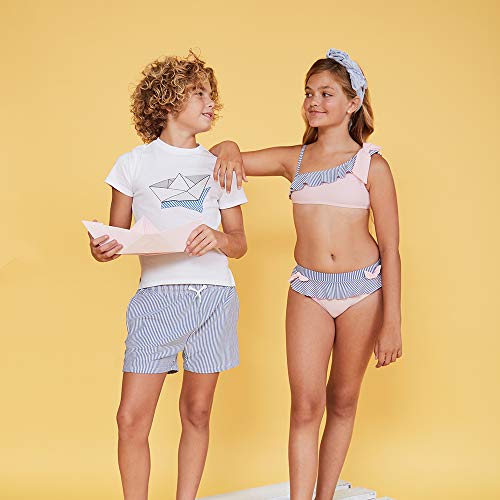 - Bikini niƱa asimĆ©trico rosa con volante en escote y en cintura del culetĆn en rayas blancas y azules 6 AƱos