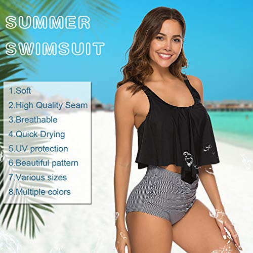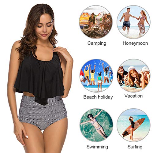 Voqeen Mujer BaƱadores Volantes Conjunto de Bikini Acolchado Rayas Imprimir de Cintura Alta con Pliegues Traje de baƱo
