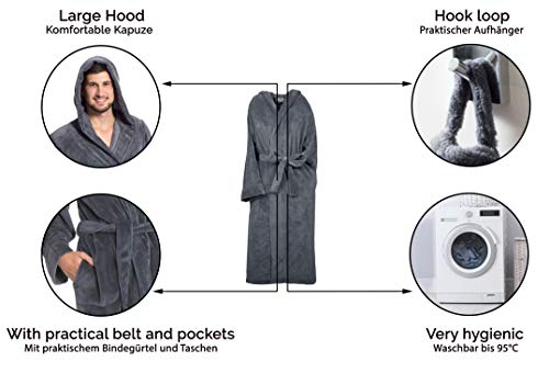 - UNISEX. Su diseño netro lo hace perfecto para hombre y mujer.Tiene dos bolsillos laterales y capucha, para evitar el frío en la cabeza. Para mayor comodidad, cuenta con un cinturo para ajustar el batín a nuestro cuerpo sin perder libertad de movimiento.