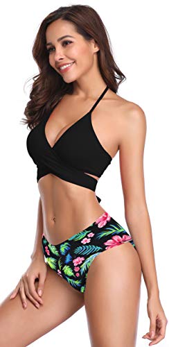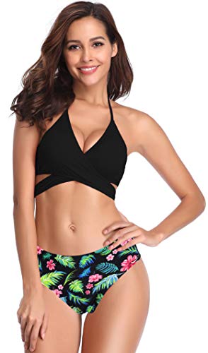SHEKINI Mujeres Front Cross Bandage Bikini Floral impresión Inferior Traje de baño Que es el triangulo bañadores de Mujer Bikini Mujer(Large, Negro)