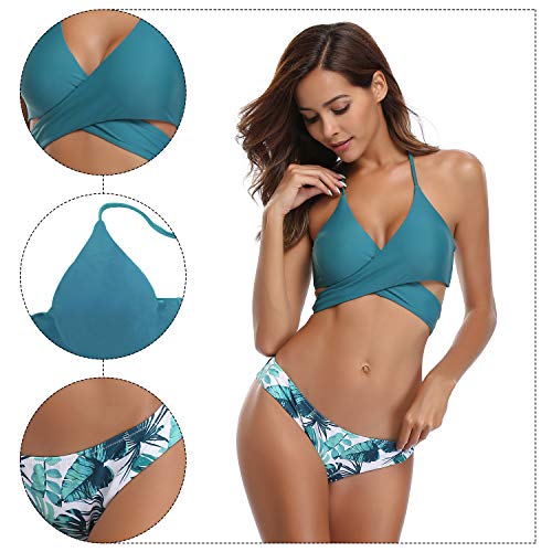 SHEKINI Mujeres Front Cross Bandage Bikini Floral impresión Inferior Traje de baño (Medium, Verde Profundo)