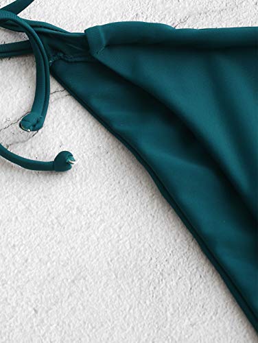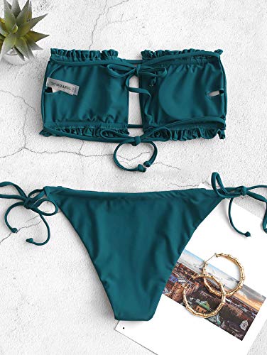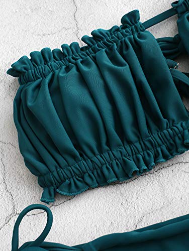ZAFUL Bikini para mujer con hombros descubiertos, con cordón y volantes, corte alto, monocolor azul pavo real S
