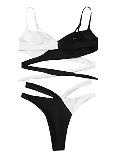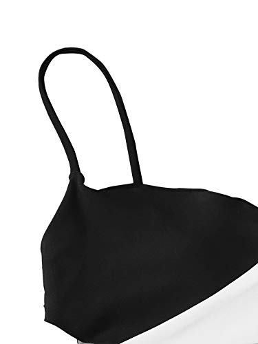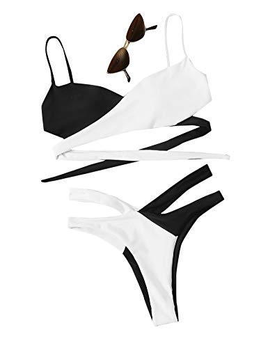 SOLY HUX Bikinis Sexy de Dos Piezas Verano para Mujer con Brasileños Tanga Alta, Conjunto de Bañador Bikini Cortado Alto Top Cruzado de Dos Colores Blanco y Negro S