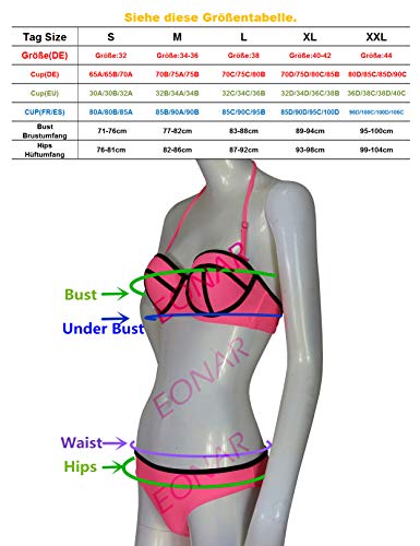 - Tallas: S - EU 36, M - EU 38, L - EU 40. Nota: la parte superior es de tamaƱo pequeƱo, ideal para copa A C. Consulta la tabla de tallas a la izquierda antes de comprar. Puede darse una diferencia de 1-3 cm respecto a las medidas especificadas.