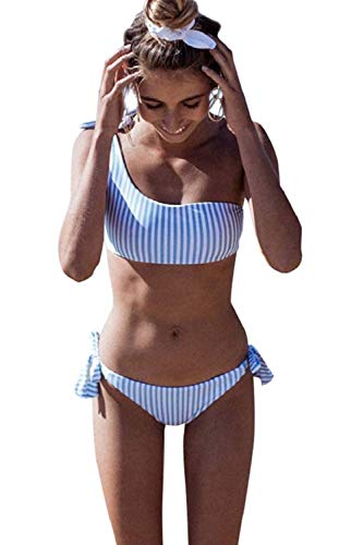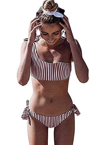 Yutdeng Conjunto de Bikini Rayas Un Hombro Mujer Traje de Baño Brasileños Trajes de 2 Piezas Halter Push Up Bikini Sexy Bandeau Cover up Ropa de Playa