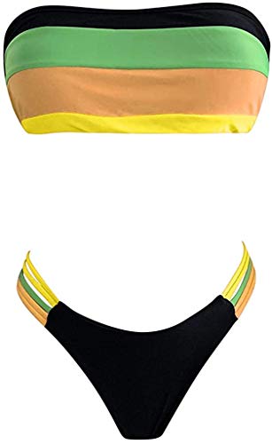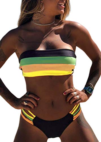JFAN Mujer Conjunto de Bikini Dividido Colorido Rayas Sin Tirantes Cosido Sujetador Acolchado Sin Respaldo Push-up Bikinis Bottoms Ropa de Playa Traje de Baño