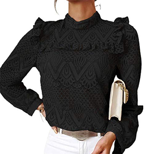 Mujer Camisa de Cuello Alto Elegante con Bordado y Encajes Blusa Manga Larga Pullover Top
