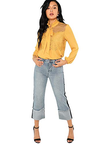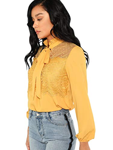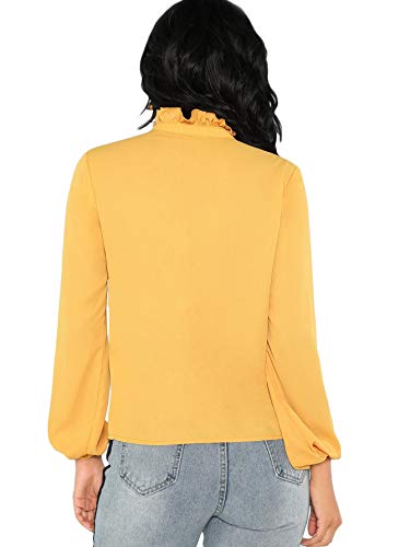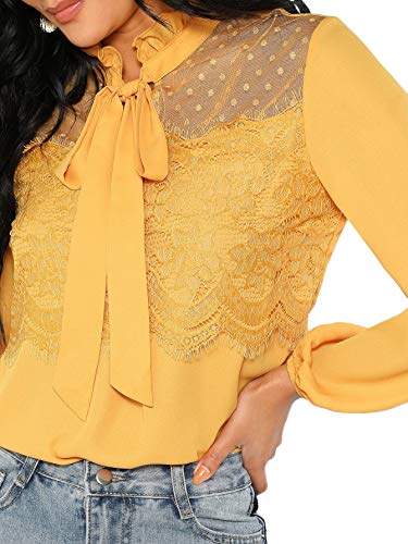 DIDK Elegante blusa de gasa para mujer, cuello alto, monocolor, camiseta de manga larga, con encaje, volantes, camiseta de trabajo, parte superior con lazo frontal amarillo S